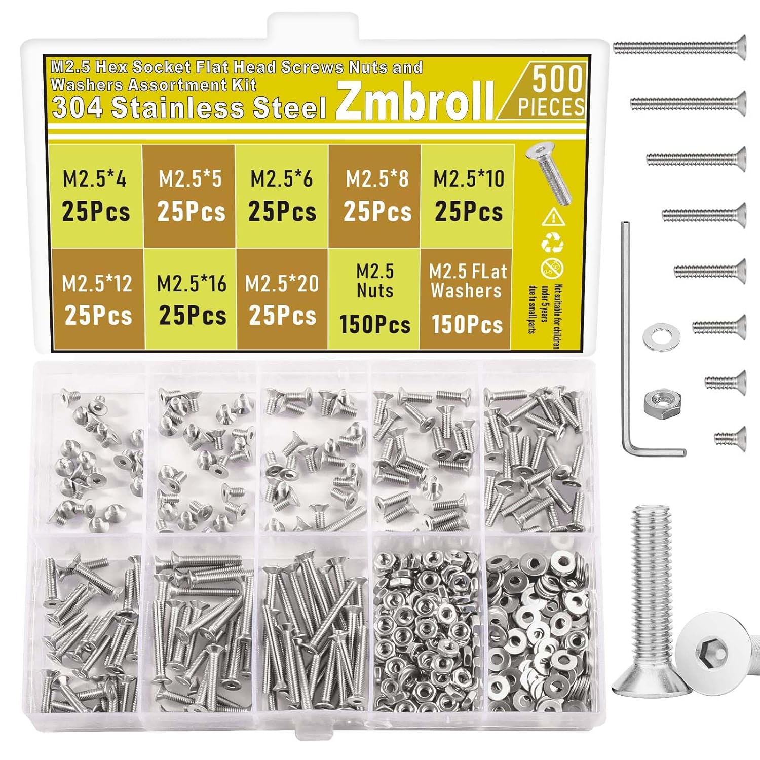 Package include:500pcs M2 countersunk hex socket machine screws Content: M2 x 4mm--- --- 25Pcs M2 x 5mm--- --- 25Pcs M2 x 6mm--- --- 25Pcs M2 x 8mm--- --- 25Pcs M2 x 10mm--- --- 25Pcs M2 x 12mm--- --- 25Pcs M2 x 16mm--- --- 25Pcs M2 x 20mm--- --- 25Pcs M2 hex nuts--- --- 150Pcs M2 flat washers--- --- 150Pcs Allen key --- --- 2Pcs Specification: Product Name: M2 Machine Screws Material: 304 Stainless Steel Thread Type :Machine screws Finish: Polishing Measurement system:Metric Color: Silver Model: M2 Length: 4mm / 5mm / 6mm / 8mm / 10mm / 12mm / 16mm/ 20mm These countersunk hex socket machine screw have standard dimensions,plain and clean surface ,Available in various sizes, you can choose the sizes you need, enough for you to use at home or work Made of high quality 304 stainless steel, corrosion resistance and anti-rust in wet environment that can be stored for a long time, high in strength, non-deforming, the hardness of 304 stainless steel is high. Wide applications: these 304 Stainless steel screws countersunk head machine screw are good choice for electricians,Suitable for household, office equipment industry, the electronics industry, the communications industry, machinery, etc. Notification: 1.The product size is very small, please read the detail sizes carefully before buying! 2.Small Parts, not suitable for children