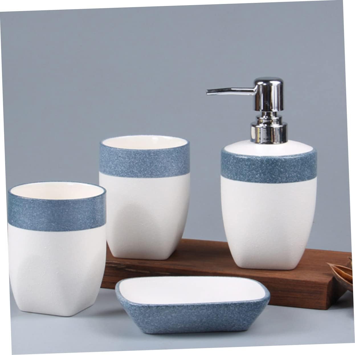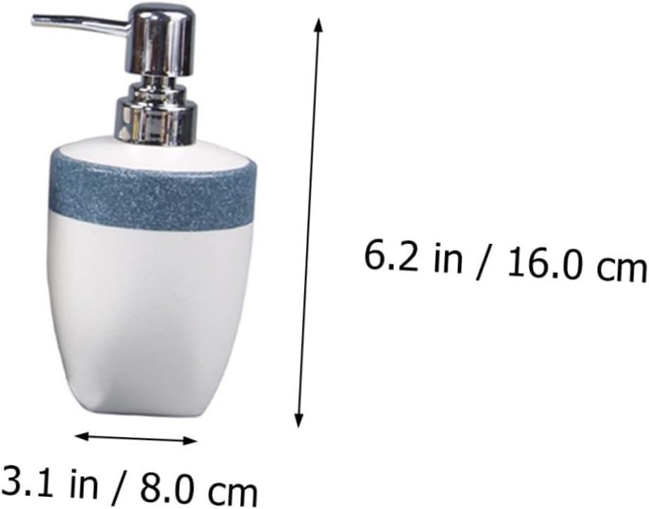 Package List 1pc emulsion bottling 1pc soap rack 2pcs tooth cup Characteristics -Material: Ceramic bathroom accessory -Color: White blue -Size: 16x8x8cm/6.29x3.14x3.14in - Easily organize of bathroom supplies, and keep the bathroom clean and orderly dispenser soap dish. - Made of ceramic material, and , support for long time use bathroom soap dispenser. - The set includes a soap dispenser, two tooth-brushing cups and a emulsion bottle bathroom tray countertop. - A set accessories for bathroom that will need. Perfect for family, friends, lover, colleagues, housewarming or wedding. - Elegant and modern appearance. Perfectly match your bathroom decoration style.