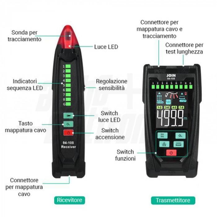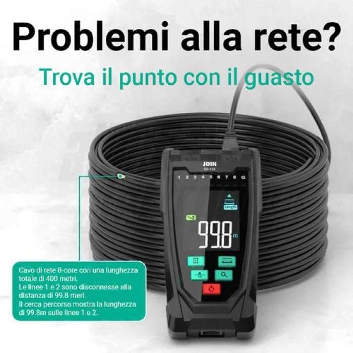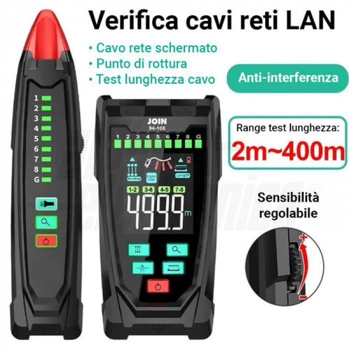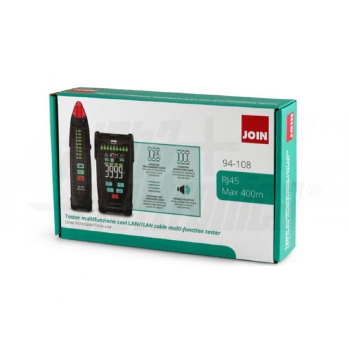 MULTIFUNCTION TESTER VERIFY LAN CABLES WITH MEASUREMENT CABLE LENGTH Portable testing tool for LAN network cables equipped with a transmitter unit and receiver unit. The transmitter has a 2.5 inch color screen to set and display measurements. It is an ideal tool for all installers who need to perform preliminary checks and checks on LAN data network installations with RJ45 type connectors. The main function of the instrument is to indicate via the display the presence of incorrect connections on LAN network cables (pairs crossed, split, inverted, open or short circuit). The tool also allows you to measure the length of the cable and detect any interruptions on torques. The tester can locate the point of a network cable failure without the need for calibration quickly and accurately. Note: The measurement on the cable should be done in open circuit. The instrument features a receiver unit that allows effective cable mapping action in the patch panel. You can search the rack panel very quickly with the help of a single operator. Executable functions: Tracking: to locate the cable 300 m Mapping: polarity and verify cable connections Cable length: 2m to 400m Receiver probe with lighting led Transmitter size: 144*74*31mm Receiver: 198*43 **1.260 in measurable sizes indication length LCD display portable format additional functions torch quantity: 1