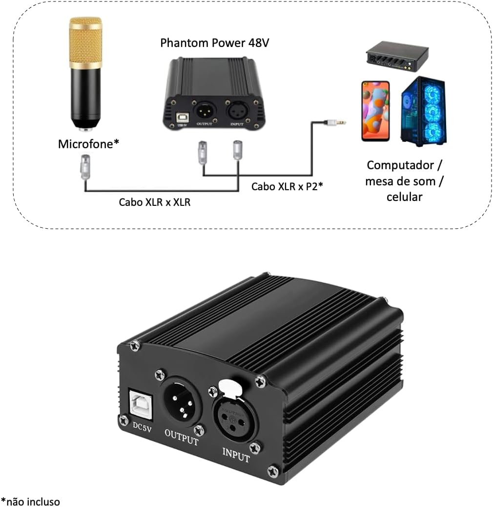 Phantom Power 48V provides power to condenser microphones and other electrical musical instruments. Transfer the sound signal to external audio/video card (on PC, sound card or other compatible device). Power can be supplied directly via computer USB port or USB charger (not included). Features a single-channel unit with balanced inputs and outputs for connection. Ideal for use in lives and streams. Share your game, expand your gamer world! FEATURES: - Consumption: 5W and down - Input: AC 110V/220V 50HZ 70mA - Output: AC 48V 600mA - ON/OFF power switch - LED indicator for ease of operation - Universal input and XLR output: Compatible with all kinds of recording equipment INCLUDED: 1x Phantom Power 48V 1x USB power cable 1x Cable XLR Female X XLR Male INFORMATION: - All of our goods are imported. - We only work with original products. - Quality and durability ensured. - Invoice issued products. - 30 day warranty against manufacturing defects. - We have authorization to sell the brand presented as well as factory invoice. - Delivery made immediately after payment confirmation, being separated, packaged and posted within 24 hours. - For return of products defective, we will exchange it for another in perfect condition.